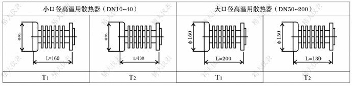 型號(hào)中出現(xiàn)T2為高溫流量計(jì),用于60-120℃帶發(fā)信器,配置短性散熱器。