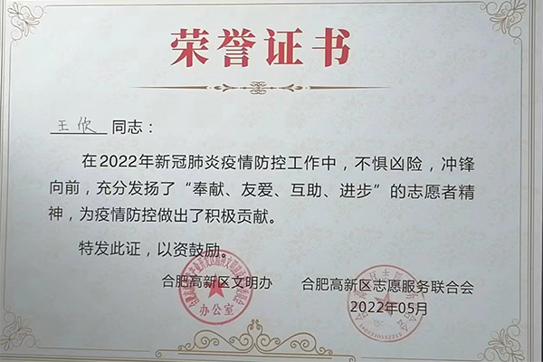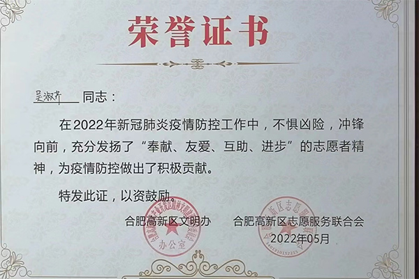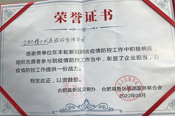 合肥精大儀表股份有限公司在新冠肺炎疫情防控工作中積極響應(yīng),組織志愿者參與到疫情防控工作中,彰顯了企業(yè)擔當,為疫情防控工作提供一份戰(zhàn)力。黨員王欣、吳淑芹二位同志在2022年新冠肺炎疫情防控工作中,不懼兇險,沖鋒向前,充分發(fā)揚了“奉獻、友愛、互助、進步”的志愿者精神,為疫情防控做了了積極的貢獻。公司和個人被高新區(qū)文明辦、和高新區(qū)志愿服務(wù)聯(lián)合會授予此榮譽證書。