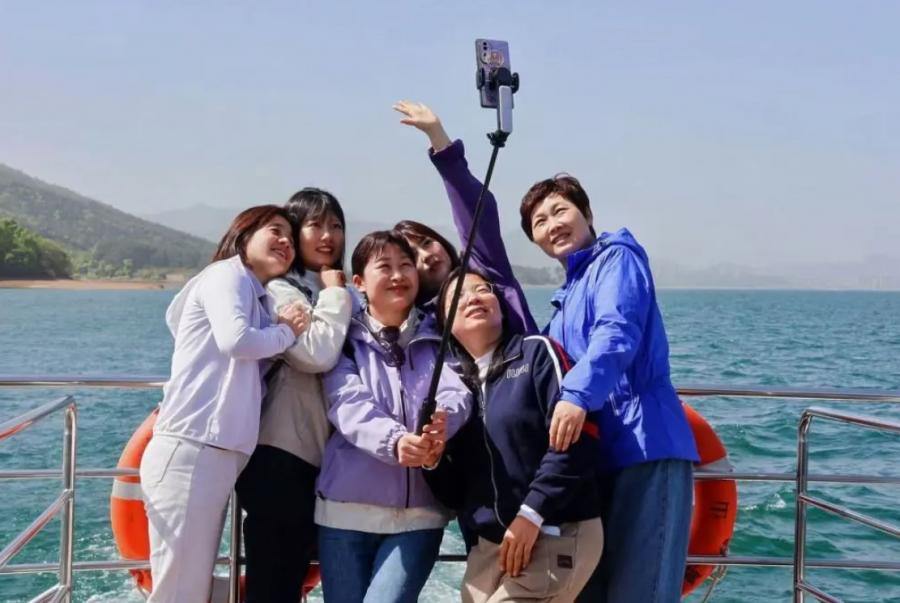 同事們紛紛拿出手機(jī),記錄下這醉人的湖光山色。游船緩緩前行,大家或憑欄遠(yuǎn)眺,或談笑風(fēng)生,盡情享受這難得的悠閑時(shí)光。